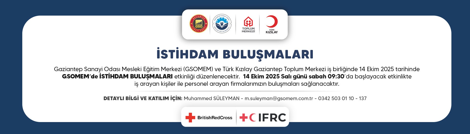 Gaziantep Sanayi Odası Mesleki Eğitim Merkezi (GSOMEM) ve Türk Kızılay Gaziantep Toplum Merkezi iş birliğinde 14 Ekim 2025 tarihinde GSOMEM’de İSTİHDAM BULUŞMALARI etkinliği düzenlenecektir. 14 Ekim 2025 Salı günü sabah 09:30’da başlayacak etkinlikte iş arayan kişiler ile personel arayan firmalarımızın buluşmaları sağlanacaktır.