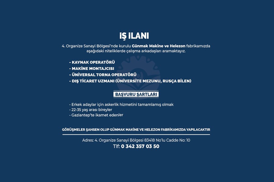 İŞ İLANI - GÜNMAK MAKİNE VE HELEZON